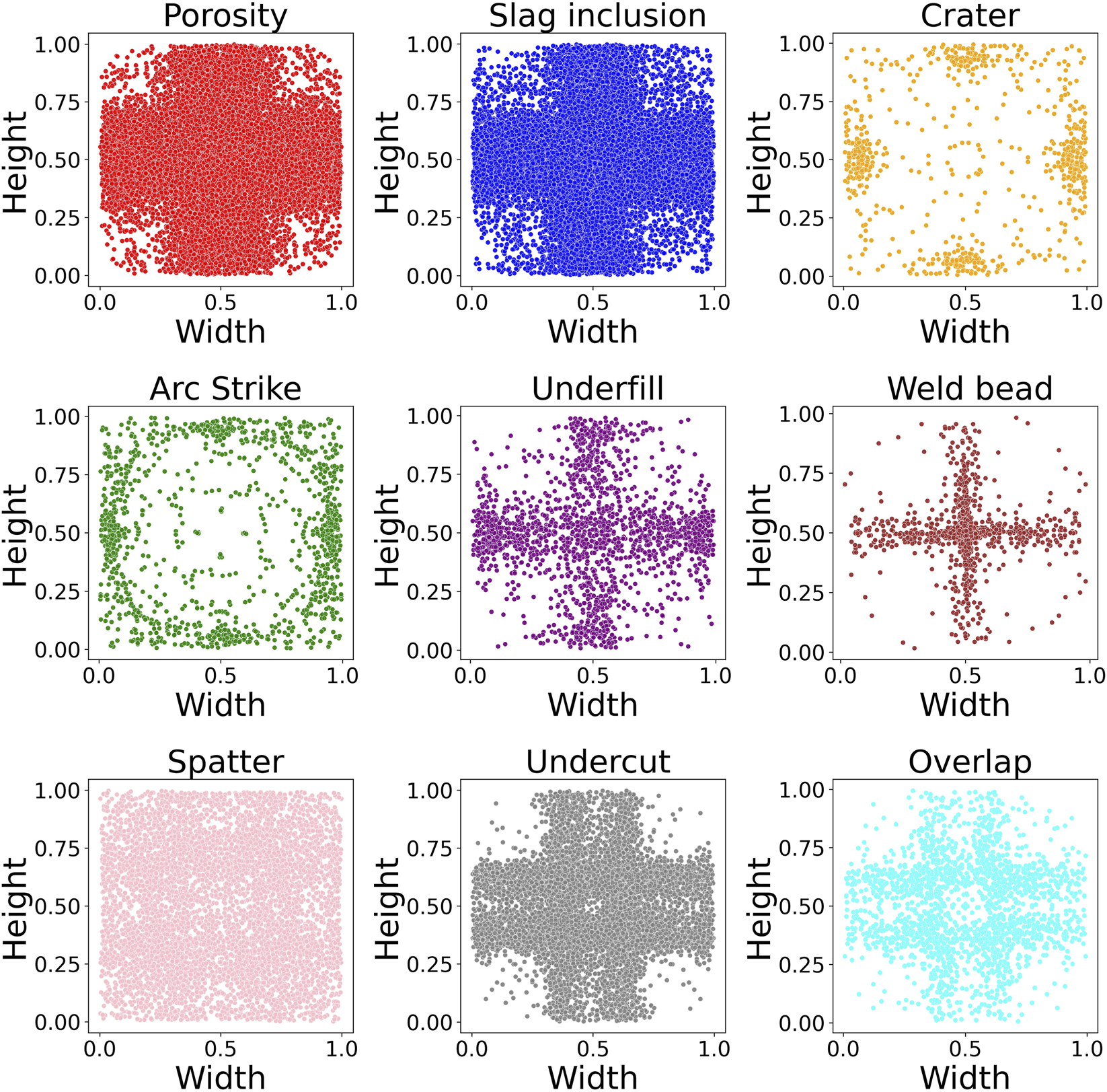 Furthermore, Figure 5 shows the positional distribution of each class. Most classes are uniformly distributed across the weld surface, while others, such as weld bead and underfill, tend to align horizontally and vertically, reflecting their natural occurrence patterns during deposition. This visualization reinforces the variability and representativeness of the dataset for training robust object detection models.