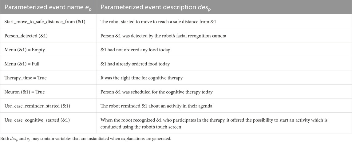 The generation of explanations requires descriptions of all events that may occur in the causal log. Such descriptions are provided in a dictionary, as exemplified in Table 2. Parameterized event names