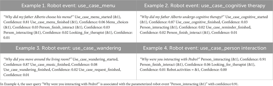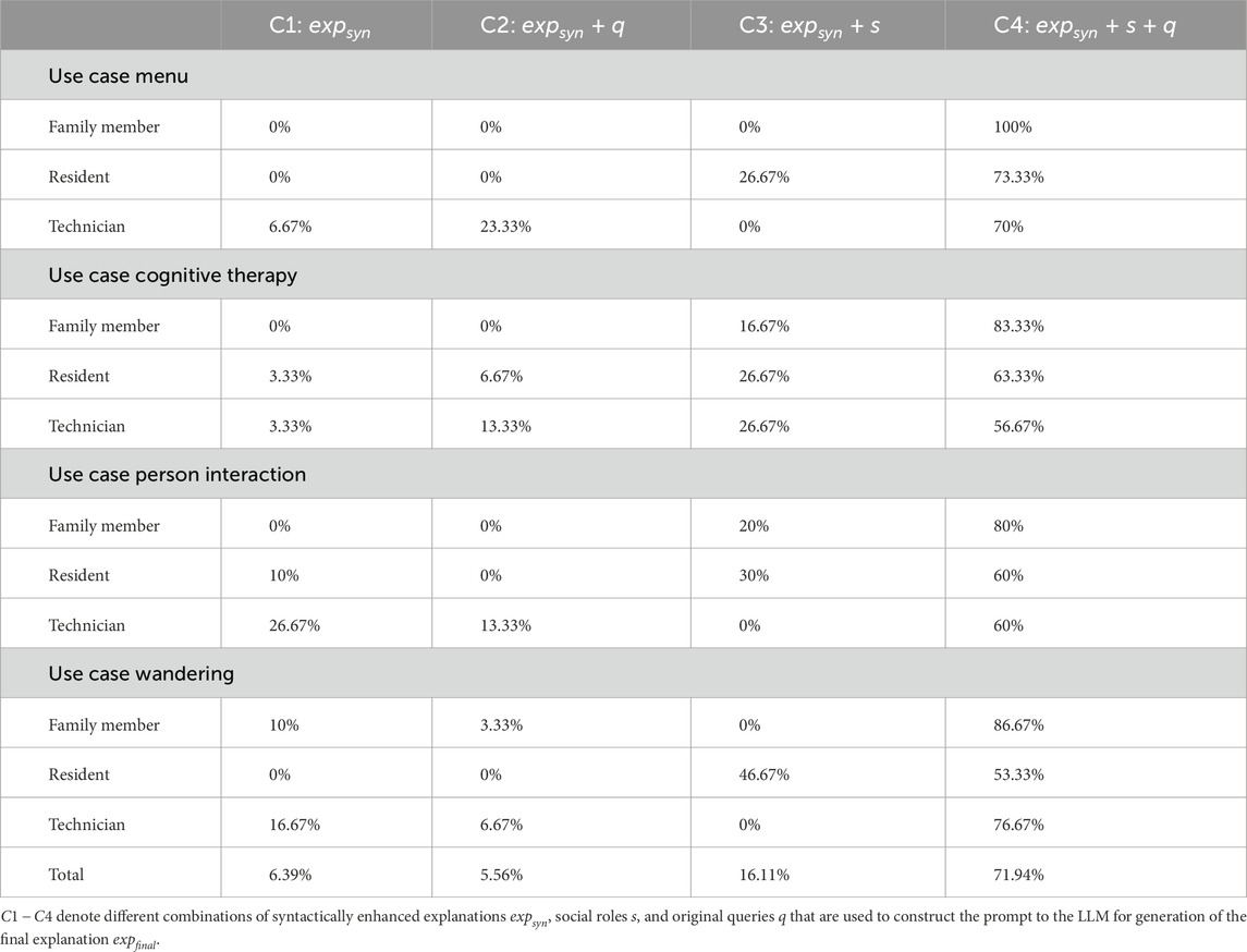 The first experiment aimed at investigating the effect of providing various types of information to the LLM for the generation of explanations. In particular, for each original query, four use cases were considered: Why did Alberto choose from the menu today?, Why did you give cognitive therapy to Alberto?, Why did you detect Jose?, and Why are you starting to move around; corresponding modified questions, tailored to one of the social roles of family member, resident, and technician, were then generated. For each such modified question, four combinations of