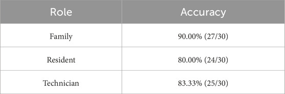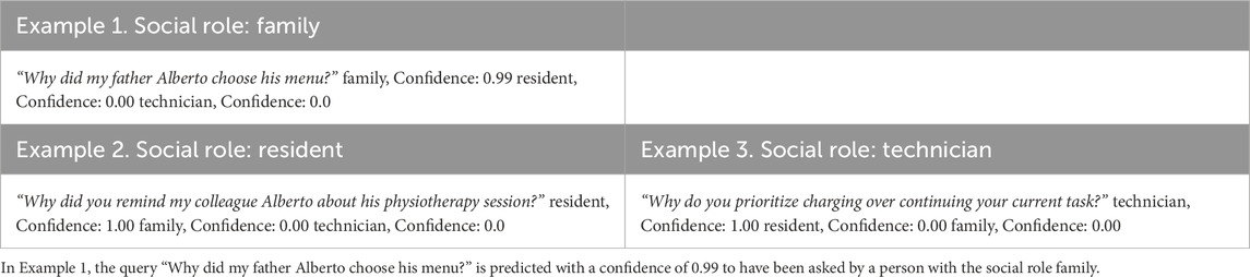 For each of the resulting 90 questions, the role was inferred by Rasa and compared with the actual role assumed by the participant formulating the question. The overall accuracy is summarized in Table 10. For example, for 27 of the 30 questions asked by participants assuming the family role, the role was correctly inferred. Incorrect inferences were mainly related to the distinction between the resident and technician, particularly for questions of a technical informative nature asked in a colloquial tone, such as “Why did the system decide to give the menu to Alberto?”. Averaged over all social roles, the accuracy was