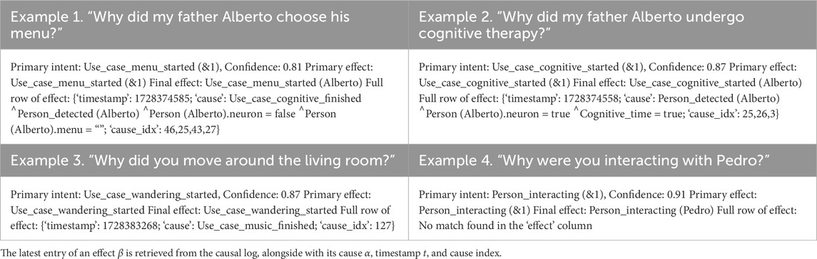The causal log is a component of a complex cognitive robot architecture CORTEX (Galeas et al., 2025). It is a tabular high-level episodic memory representation, and the causal log entries are automatically generated in real-time settings. In particular, the cause column is filled in with states/actions extracted from behavior trees that control the robot’s behavior. These behavior trees are defined at design time and specify both task steps and conditions that trigger robot behavior changes. When such a change occurs, the system automatically records one row in the causal log.