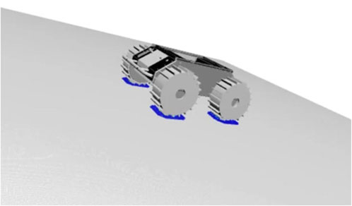 Investigating the relationship between various parameters and slip characteristics through experiments is not practical due to the enormous number of test cases required and accurately reproducing space conditions on Earth is difficult. Therefore, simulating low-gravity conditions and analyzing rover behavior is also a valuable approach for space applications. In fact, studies have analyzed the slip characteristics of NASA’s VIPER using a multi-body dynamics simulator (Hu et al., 2025). In this study, the open-source software Project Chrono was used to create datasets (Tasora et al., 2016; Mazhar et al., 2013). Considering the trade-off between computation time and model accuracy, the Soil Contact Model (SCM) was adopted (Krenn and Hirzinger, 2009). SCM represents the wheel as a polygonal mesh and performs contact detection with the ground for each grid, calculating the pressure acting on the wheel based on the Bekker-Wong theory (Bekker, 1969). This calculation is very simple, light on computational load, because assuming ideal contact conditions. SCM provides results that are reasonably close to actual phenomena, but the soil on actual planetary surfaces may consist of mixed soils with different properties and may include coarse materials such as gravel and rocks. As another approach, Discrete Element Method (DEM) simulations provide results that are more accurate than SCM, but it is still known to deviate from real-world behavior. In addition, DEM requires long computation times, making it unsuitable for applications such as generating large datasets, as in this study. Figure 1 shows a simulation of a 4-wheeled rover in the Project Chrono environment. The area where the wheels are in contact with the soil and pressure is generated is visualized in different colors.