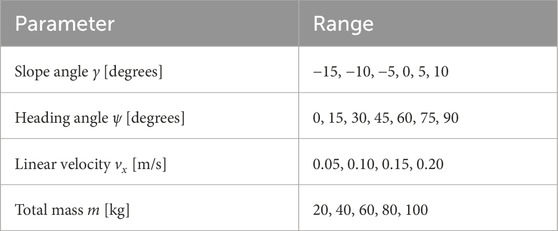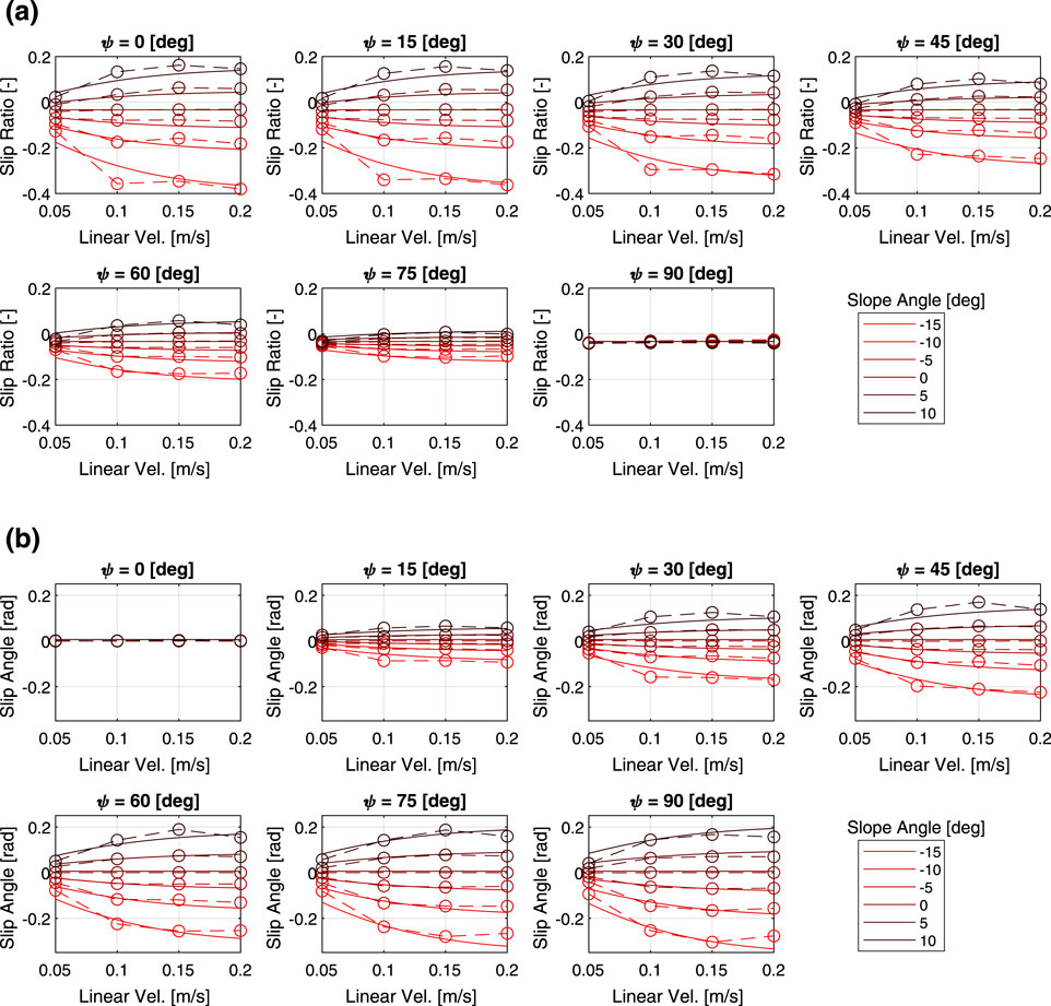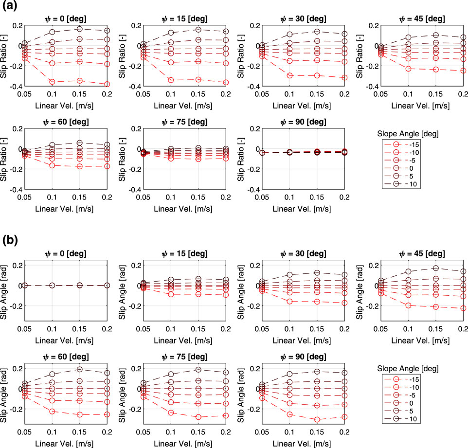 Figure 3 shows the relationship between the slip characteristics and the three parameters of heading angle, slope angle and linear velocity command. Here, the mass is fixed at 60 kg. Regardless of the other parameters, the slip ratio tends to increase as the slope angle increases. The slip ratio increases as the heading angle approaches zero, while the slip angle tends to decrease. The slip ratio and slip angle also tended to change more sensitively with the slope angle as the translational speed increased. In addition, while linear velocity had a large effect on the slippage when the velocity is small, the slippage do not change much when the velocity increases to a certain degree.