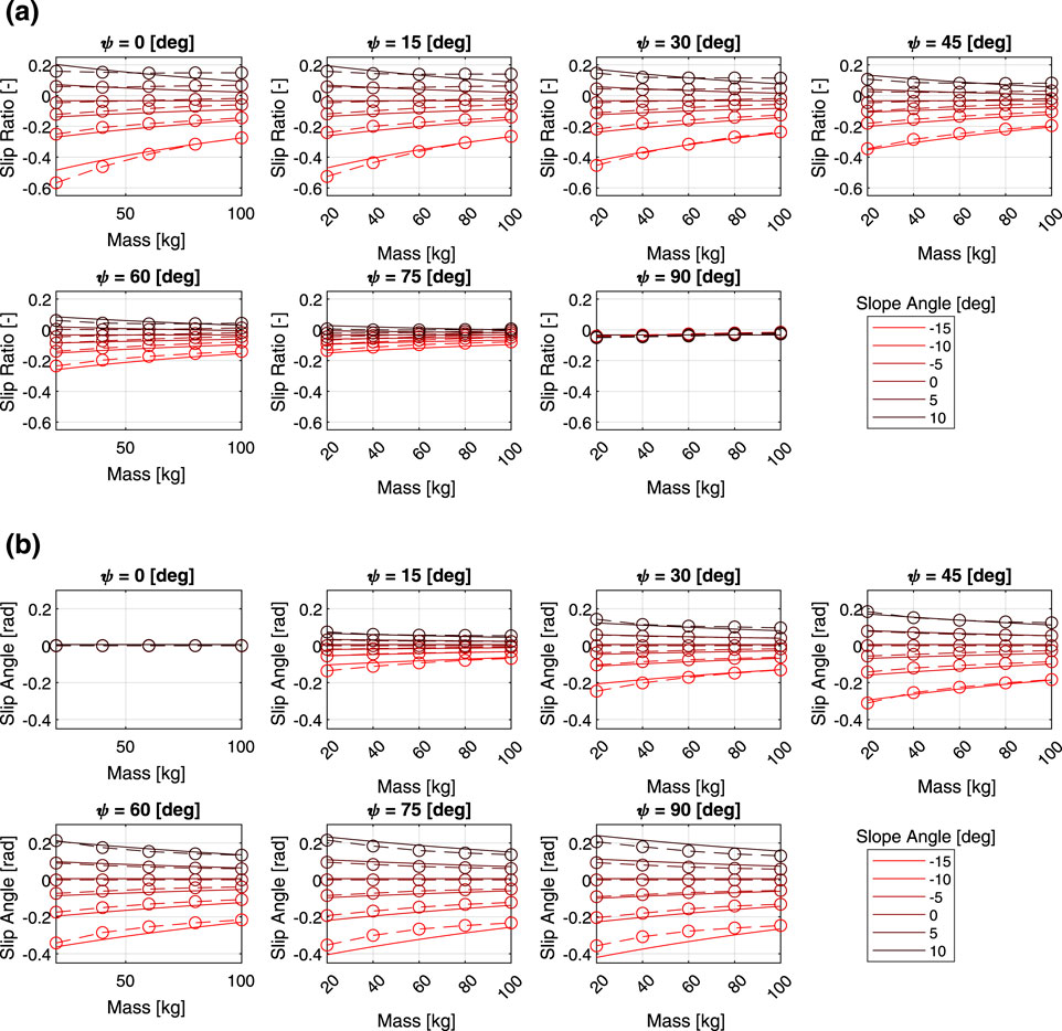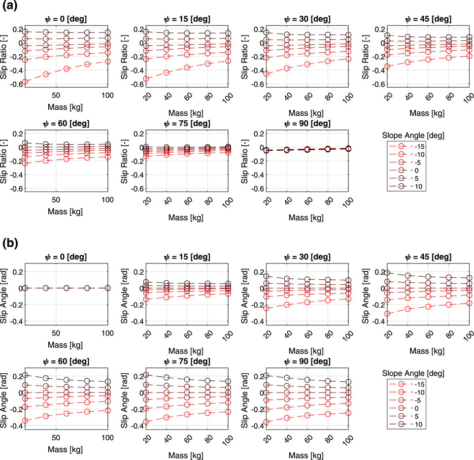 The fourth factors in the first product terms of Equations 3, 4 corresponds to the mass-dependent term. As the mass increases, the slip ratio becomes less sensitive to the slope angle, and a similar trend is observed for the slip angle. This is likely because the increased mass causes the wheels to sink into the ground, increasing the contact area between the wheel’s surface and the soil, which in turn increases the shear stress.