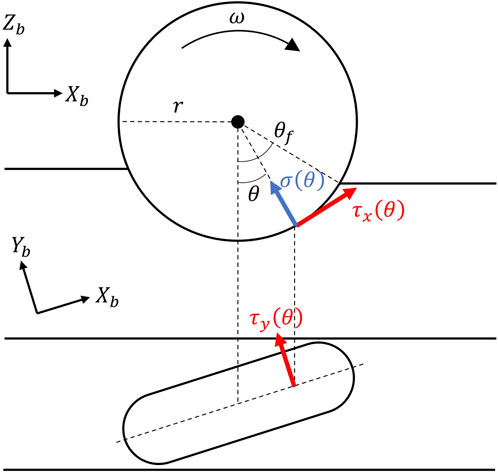 The normal and shear stresses beneath a wheel on the loose soil can be modeled as shown in Figure 5. In Equations 3, 4, the effect of angular velocity is formulated using hyperbolic tangents. If the angular velocity is sufficiently low, the rover behavior follows the terramechanics theory under static conditions. Equation 6 represents the shear stress