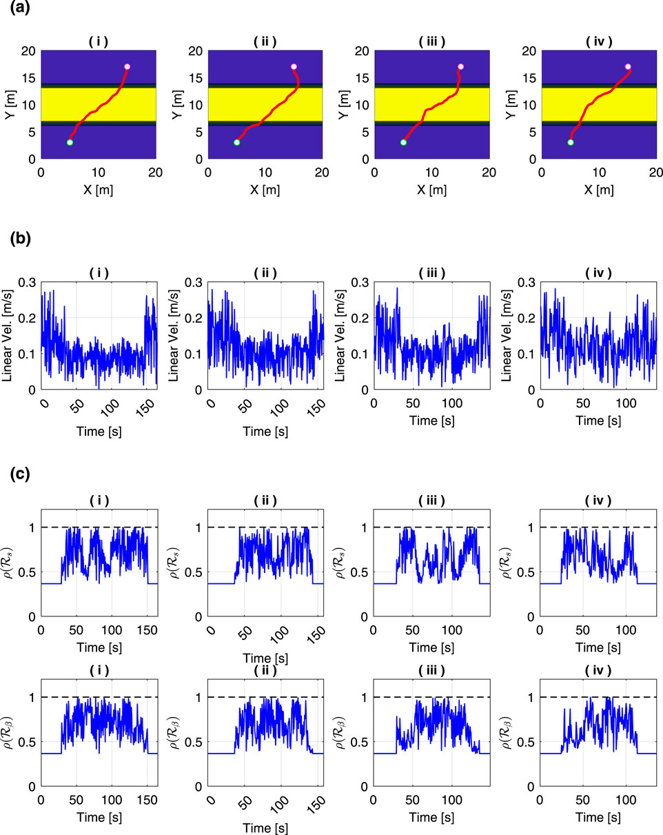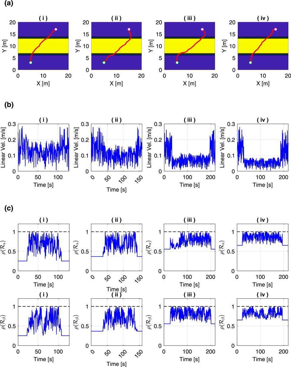 Figure 12c shows the time history of the risk metric for each case. The risk metrics remained below 1 in all cases. It was demonstrated that by using the RRT algorithm, the rover can safely reach the target position even under conditions of increased slip risk due to mass parameter settings, by appropriately adjusting its linear velocity and trajectory.