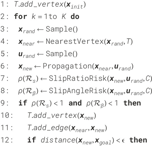 The proposed traversability assessment model should be set as a hard constraint for motion planning because it is a metric for avoiding vehicle getting stuck and any deviation from the specified value may lead to mission failure. As a result, a risk-constrained kinodynamic Rapidly-exploring Random Tree (RRT) algorithm was adopted for performance evaluation in this study. Algorithm 1 represents the algorithm of risk-constrained kinodynamic RRT. The initial state of the rover is