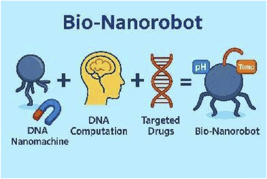 Nano sized biologically compatible robots called nano bio-robots or nano bio-robots are machines between 1 and 100 nm in dimensions and engineered to function at a scale that facilitates direct interaction within cells (Hulla et al., 2015). Vadlamani (2010) explains that these tiny robots can be programmed to interact with their environment on a molecular or cellular level and perform a variety of tasks. In light of their accuracy in manipulating chemicals, nano bio-robots have potential across various sectors, particularly healthcare, environmental monitoring, and manufacturing (Zhao et al., 2023). However, the concept of nano bio-robots revolves around utilizing advanced technology to manipulate materials at tiny scales with supramolecular dimensions where the process need to be operated at atomic and molecular scales (Wang, 2018). Autonomous robots at miniature scales exist to assemble themselves from basic components. The assembly process is controlled by intermolecular forces including hydrogen bonds and van der Waals interactions and hydrophobic effects (Lombardo et al., 2020). The process of autonomous assembly enables the creation of complex nanostructures which form the basis for nano bio-robots (Wei et al., 2021). Often times researchers have also focused on creating DNA based nano bio-robots which are called DNA Nanomachines where DNA is the body and DNA based computation serves as the brain. DNA origami is encapsulated with Iron (Fe) nanoparticles for external magnetic based actuation and mixed with drug. The actuation of nano bio-robot can be triggered using pH, temperature of the body. The development of nanotechnology enabled the construction of these robots more which show promise to revolutionize medical diagnostics procedures and drug delivery systems and surgical methods (Nelson et al., 2010; Klocke and Gesang, 2003).