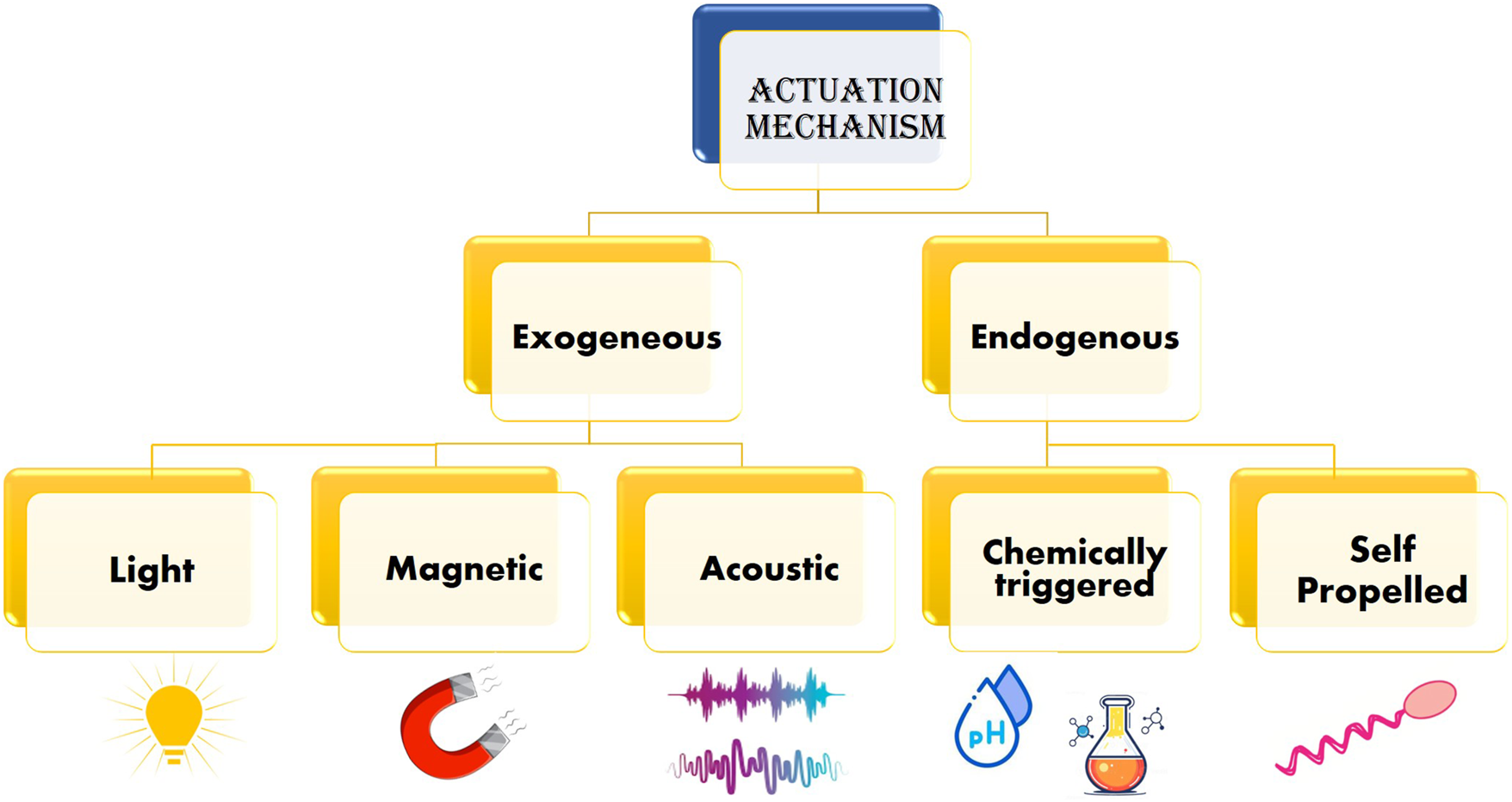 The nano bio-robots must be administered into bloodstream to deliver the targeted drug (Martel, 2010). However, in order to do so, the drug along with the nano bio-robot must overcome the hydrodynamic drag due to viscoelastic properties of the blood itself (Ahmed et al., 2015). Therefore, based on the type of energy, key actuation methods are classified as shown in Figure 3.