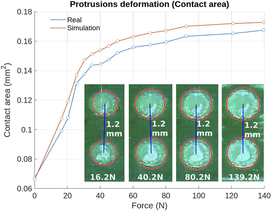 Validation of the material characterization using FTIR theory through measuring the protuberances’ contact area with the dielectric deformation under an applied normal force. The increase in the contact area of the dielectric cones is highlighted in a red circle in the images below the deformation curve.