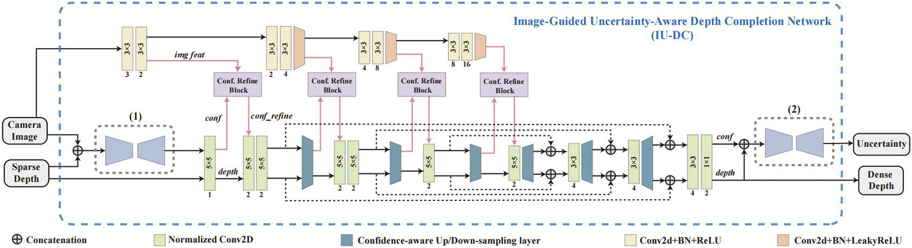 An overview of the proposed IU-DC. (1) Input Confidence Estimation Network, (2) Model-Based Uncertainty Estimation Network. The middle section with the Confidence Refine Block (Conf. Refine Block) represents the Image-Guided Normalized Convolutional Neural Network.