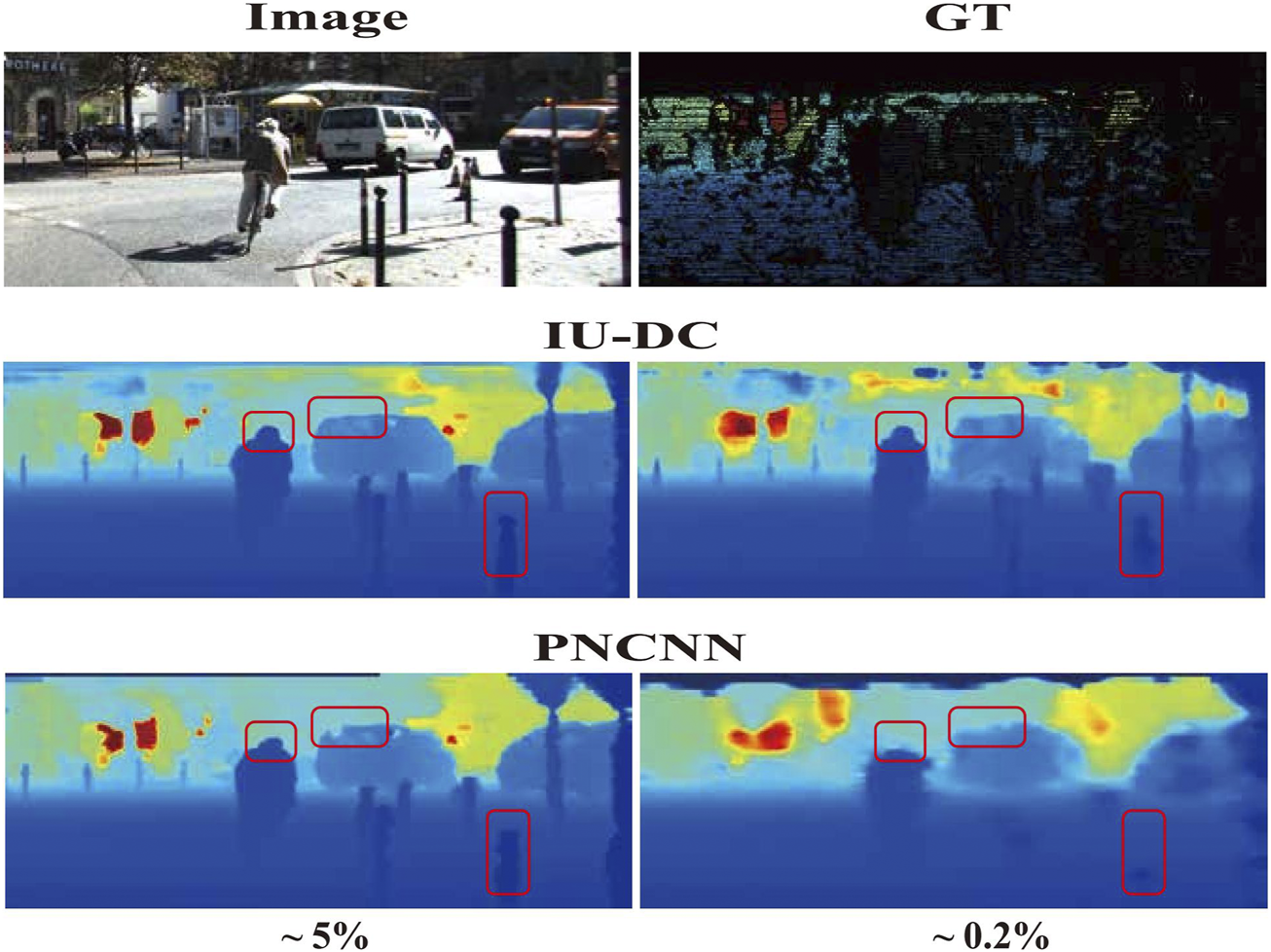 Visualization of depth completion results on the KITTI dataset, where and denote the percentage of available pixels in the depth image. PNCNN performs well under low sparsity but exhibits blurriness on the contours of objects and fails to capture most information under high sparsity. In contrast, IU-DC shows more robust performance in both cases.