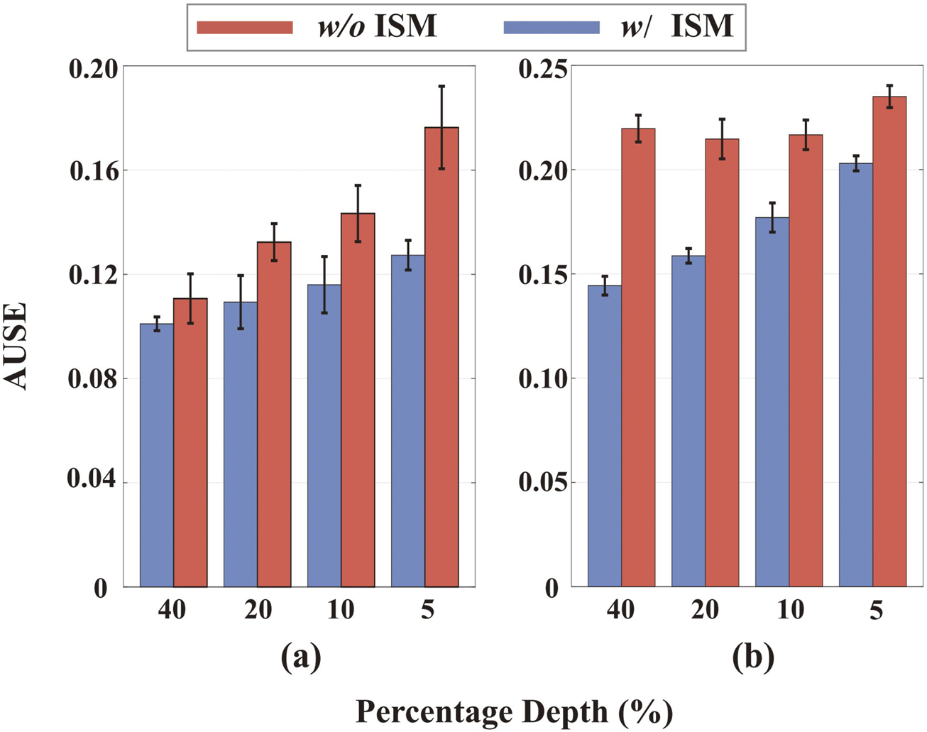 Qualitative and quantitative evaluation of the effectiveness of the Model-based Uncertainty Estimation Network. The upper part of the figure presents the input image, sparse depth from VO, uncertainty estimation from the last NCNN layer, and the final uncertainty estimation from our network (ISM-net). The lower part of the figure illustrates the area under the sparsification error plots (Ilg et al., 2018), where curves closer to the oracle represent estimated uncertainty that more closely approximates the real error distribution. ISM-net significantly enhances the uncertainty estimation from NCNN and outperforms the ISM by a large margin.