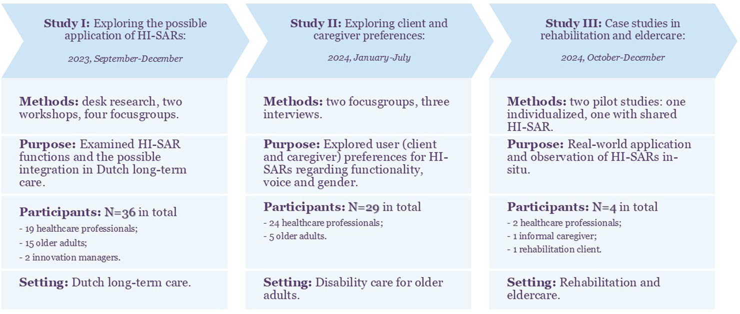 This research comprises three studies conducted between September 2023 and December 2024 by researchers from Vilans, the national centre of expertise on long-term care in the Netherlands, in collaboration with the Hague University of Applied Sciences and Eindhoven University of Technology. The studies aimed to explore the potential of HI-SARs in long-term care, using a combination of semi-structured interviews, focus groups, and pilot testing.