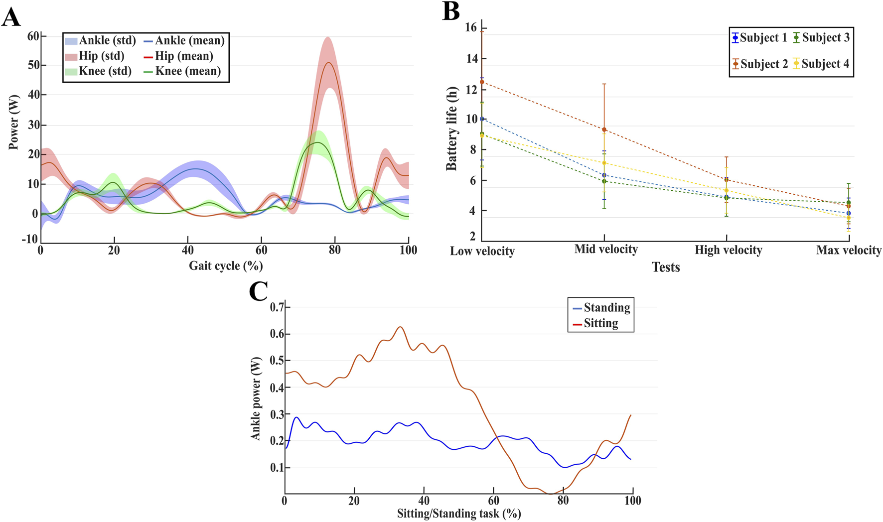 Figure 5. (A) Mean and standard deviation of power consumption for hip, knee, and ankle joint for user two walking at maximum gait speed. (B) The average estimated battery life for all the users at different gait speeds. (C) Ankle power consumption averaged between all users during the sit-to-stand and stand-to-sit tasks.