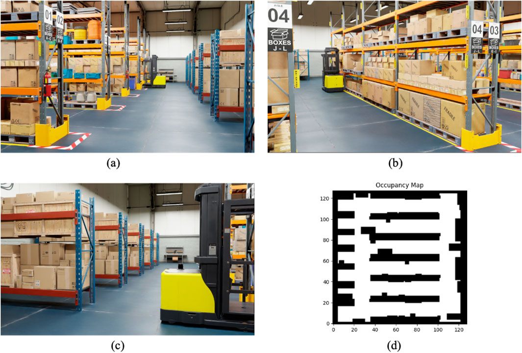 The observations used by the agent are divided into two main categories: image observations and vector observations. These observations provide the agent with essential spatial information about the environment, enabling it to navigate through dynamic and static obstacles in the warehouse effectively. The following sections detail the components of each observation type and their role in the decision-making process.