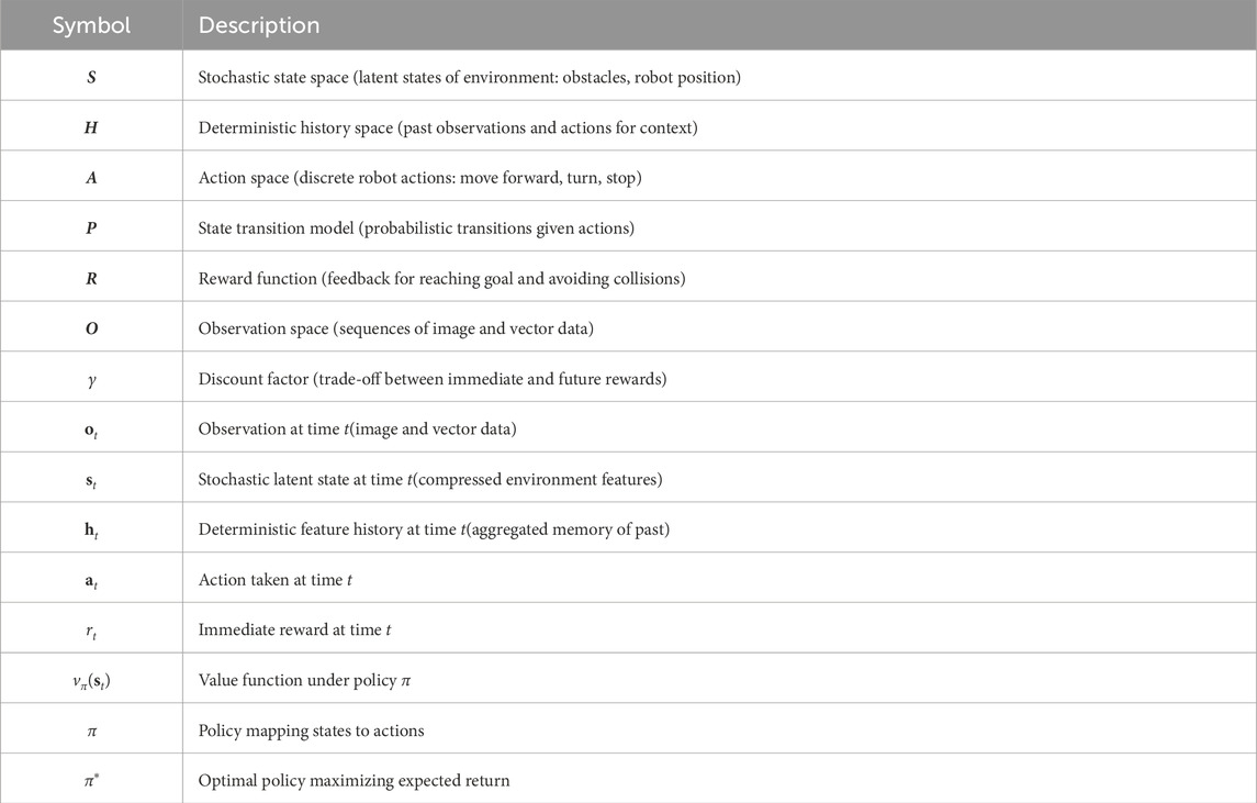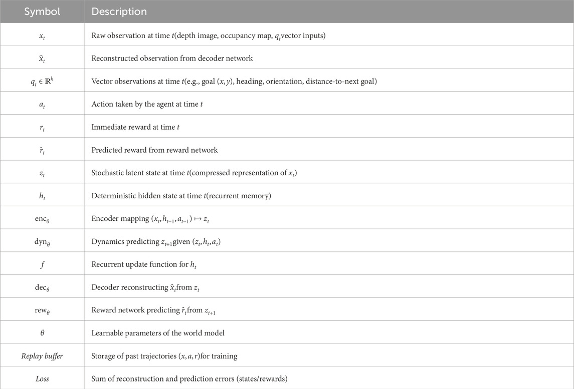 Our navigation framework is based on a world model, based on the DreamerV3 architecture, which learns to predict environment dynamics in a latent space. This model enables the agent to simulate future trajectories and plan actions without direct interaction with the environment. Using these internal simulations, the agent can make informed and sample-efficient decisions in complex dynamic settings. The world model is a deep neural network that captures the underlying dynamics of the environment by learning from the agent’s experiences stored in a replay buffer. The model is trained to predict future states, rewards, and other critical elements necessary for effective navigation. Table 2 summarizes the notation used in the world model formulation.