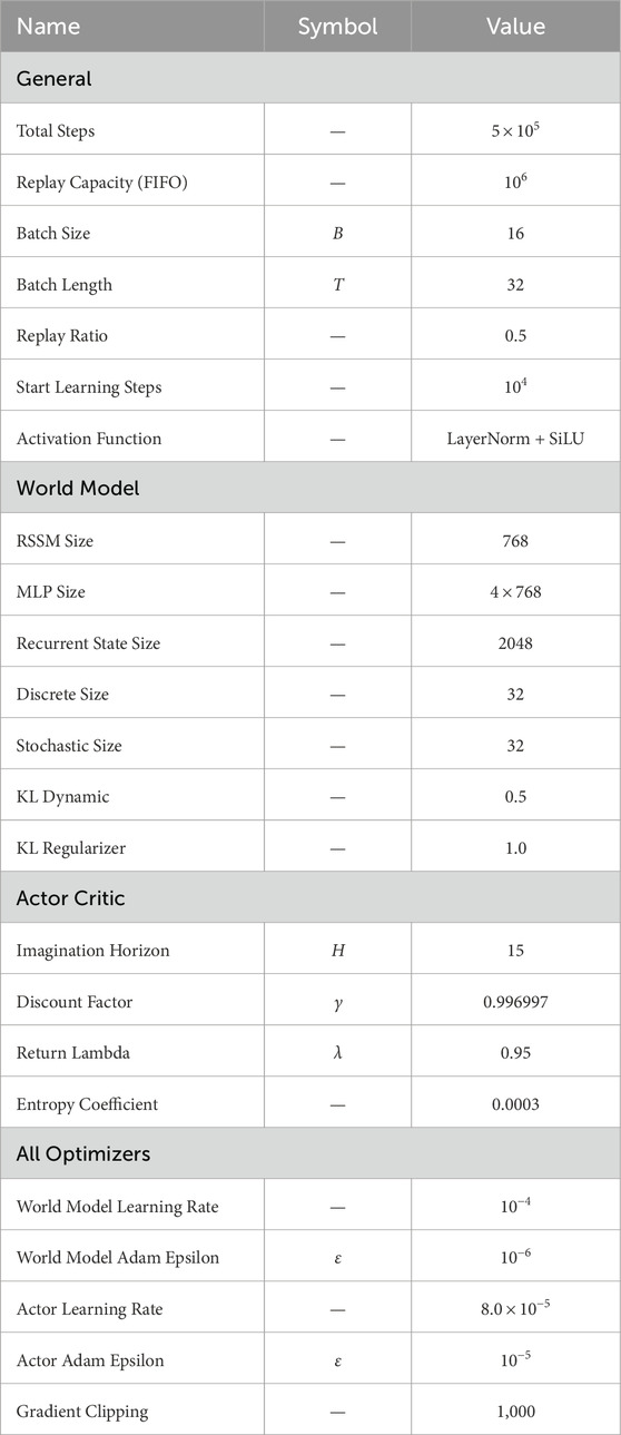 The hyperparameters listed in Table 3 were chosen based on empirical testing and optimization to balance model accuracy, stability, and computational efficiency. For the world model, we utilize a Recurrent State-Space Model (RSSM) with a size of 768 and a multilayer perceptron (MLP) size of