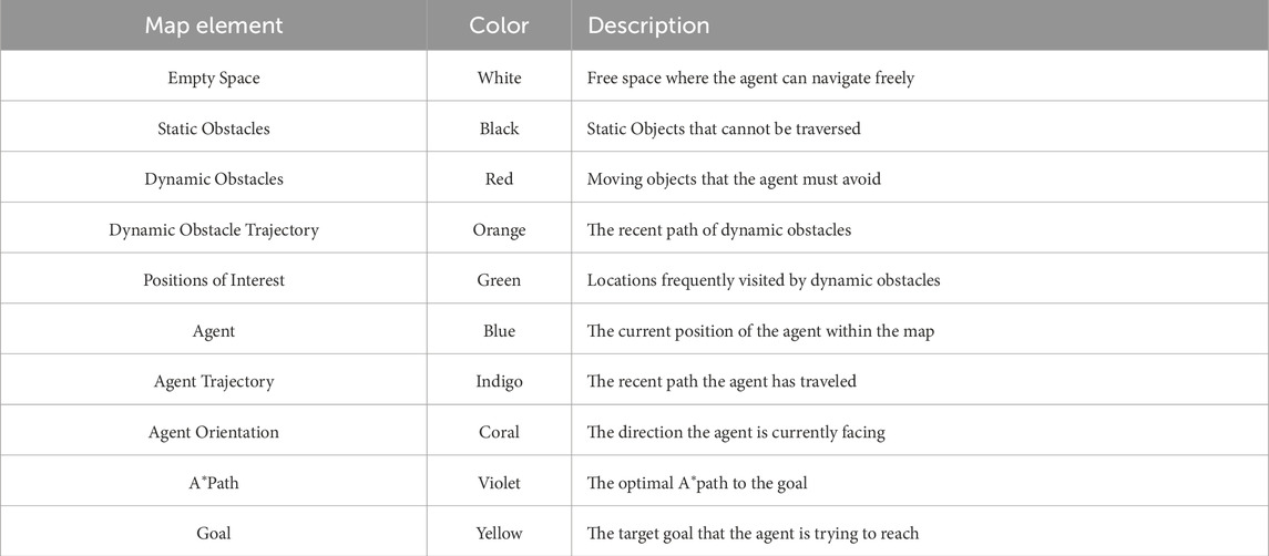 Table 4 provides a detailed description of the different elements of the map represented in the map observations. Each row describes a specific type of object or space in the environment, along with the corresponding color used to visualize it in the observation map.