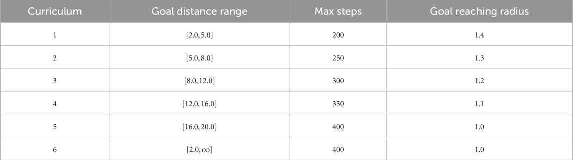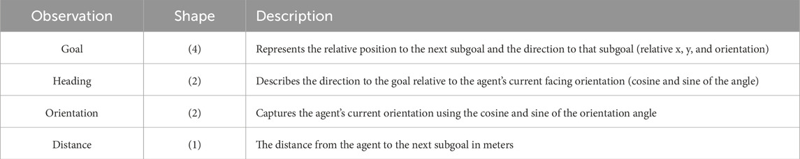 Table 5 outlines the key vector observations that provide the agent with structured information about its position, orientation, and relationship to its sub-goal. Each observation is described in terms of its shape and function in the navigation process, offering insights into how the agent makes decisions based on both its own state and its goal.
