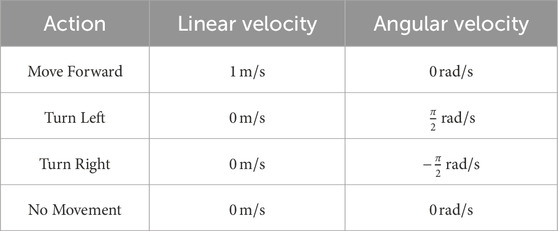 In our framework, the agent operates in a discrete action space where each action corresponds to a specific movement or rotation. The agent selects four possible actions at each time step that determine how it moves within the environment. Table 6 summarizes the discrete actions available that control the agent’s navigation behavior.