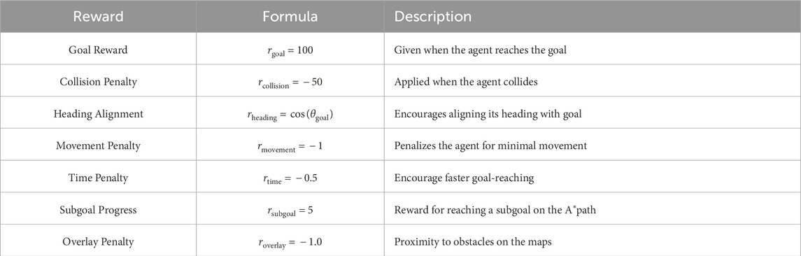The rewards of our navigation framework are designed to balance efficiency in achieving goals with safe obstacle avoidance. Through extensive testing and reward engineering, we have developed a reward scheme that encourages the agent to prioritize efficient navigation while avoiding collisions. The overall reward for each step is calculated as the sum of individual rewards as defined in Equation 13: