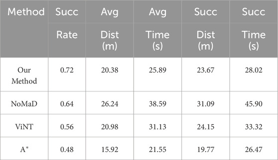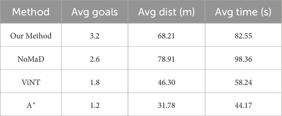 Figure 1. Scenario 3: Navigation in a confined space with multiple dynamic obstacles. All methods fail to reach the goal. Our method makes limited avoidance adjustments and collides with a moving obstacle. NoMaD and ViNT take large detours but still collide, reflecting overly conservative avoidance. A* fails due to its static path intersecting a moving obstacle.