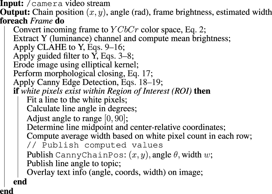 The outputs from both pipelines are fused in a unified perception node. This module generates a message containing both the visual tracking state of the mooring line and detection flags from the object detection model. This message is published as a YoloCannyChainPose and passed to the decision-making node, which interprets the incoming visual data to determine actions.