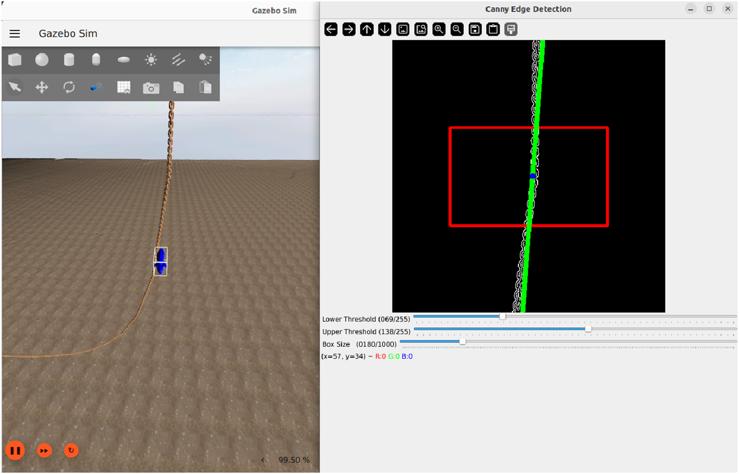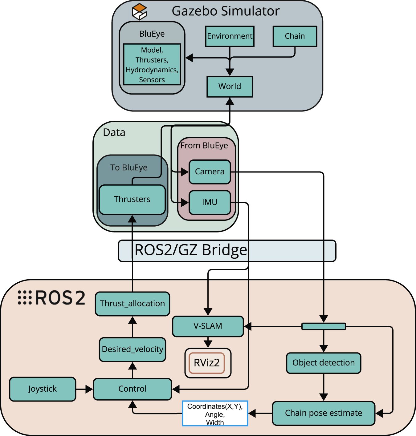 Figure 5 provides an overview of simulated system architecture used for testing and validation. Within the Gazebo simulator, a virtual model of the Blueye operates in a 3D world that includes hydrodynamics, thruster modelling, and a mooring chain. Simulated sensor data, such as video from the onboard camera and inertial measurements from the IMU, are published through Gazebo and bridged into ROS 2. This data is used by the perception pipeline, which includes both object detection and mooring line tracking algorithms. The output of these nodes is fused into a pose estimate for the mooring line, which is published to the topic/ChainPos.