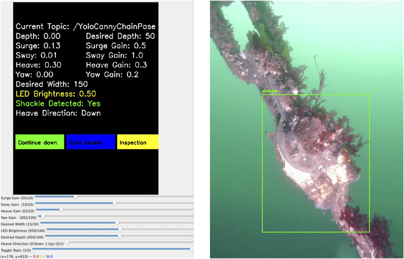 More advanced navigation and inspection capabilities have been achieved using high-resolution sensors such as sonar and multibeam imaging. These systems have enabled robust chain-following and localization in AUVs, albeit with potentially cost implications due to sonar sensors (Maurelli et al., 2016). While these results demonstrate the upper limits of inspection autonomy, their hardware requirements could limit adoption in cost-sensitive applications. Inspired by this, this paper aims to achieve similar levels of autonomy using only affordable visual sensors.
