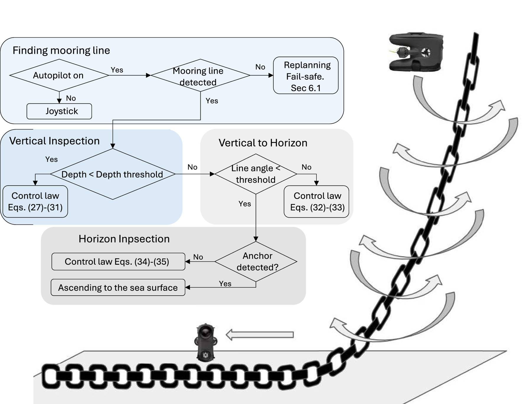 Mooring lines extend from the fairlead at the floating structure to an anchor on the seabed, covering a trajectory that may shift from near-vertical to horizontal. In addition, a mooring line experiences dynamics due to platform motion, hydrodynamic forces, and line elasticity. The inspection system must be capable of following this continuous span—often tens to hundreds of metres in length—while maintaining a stable trajectory and viewing angle. This requires a navigation strategy that supports line-following over varying orientations and depths.