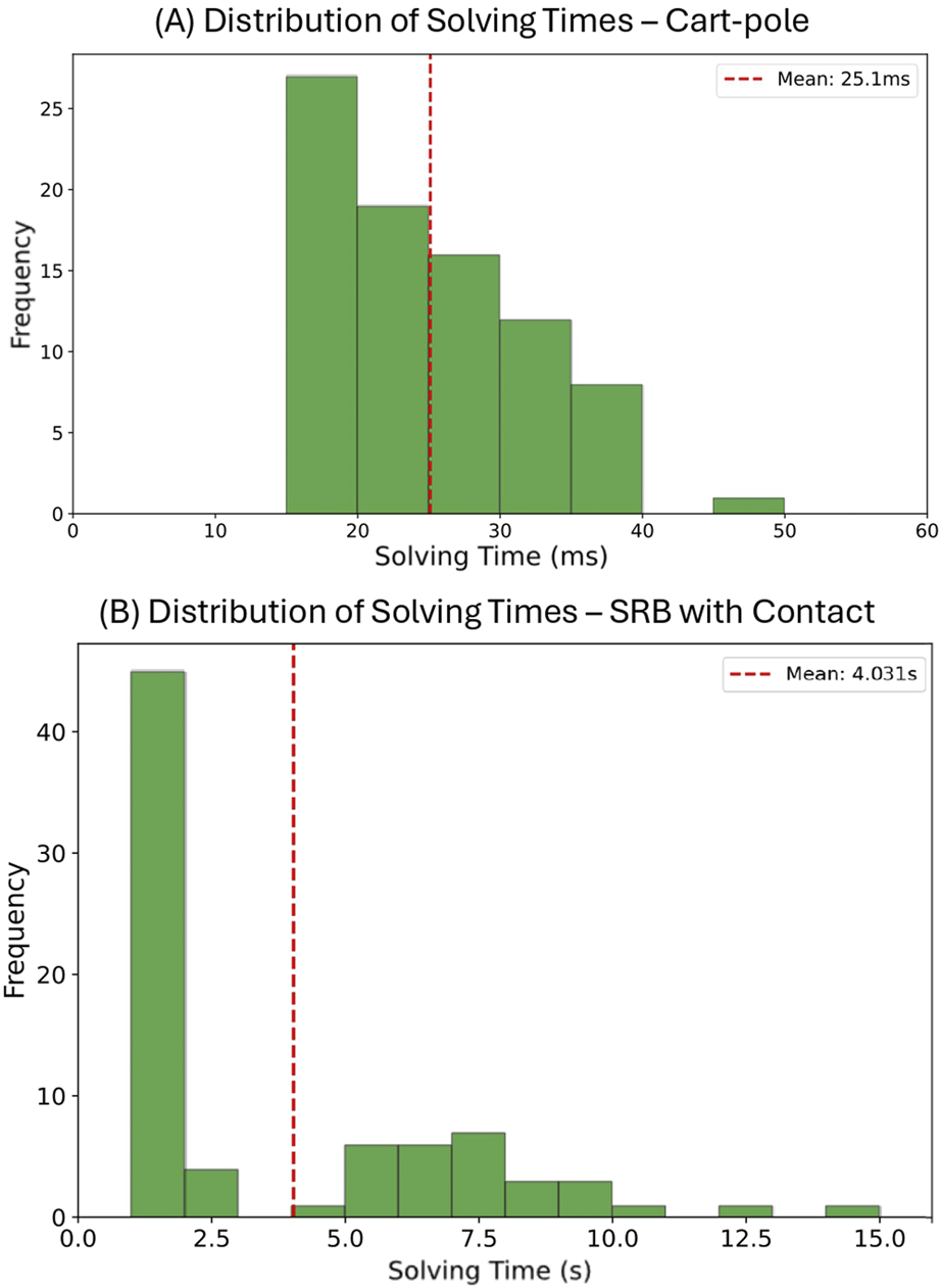 We evaluated the success rate, solving time, and solution quality for each method. The “Amount of data” row indicates the number of offline-solved problem instances in the dataset (zero for non-data-driven methods). The “Success rate” row shows the percentage of test problems solved successfully: for manual initialization methods, this represents a single solving attempt; for data-driven methods, the format indicates cumulative success rates when trying nearest neighbors sequentially until a solution is found. The “Average solve time” represents the mean computational time across successful problem instances, including all KNN neighbor attempts until success. We also provide a histogram showing the distribution of solving times in subplot (A) of Figure 1, indicating how many problem instances are solved within each time interval for data-driven MPCC with 50 training samples. The distribution for 500 training samples exhibits a similar pattern. For data-driven MICP, all problem instances are solved within 1 m. The “Avg. # of neighbors” indicates the average number of KNN neighbors attempted before finding a successful solution. The remaining rows show the average objective value among successful solutions and the solver used.