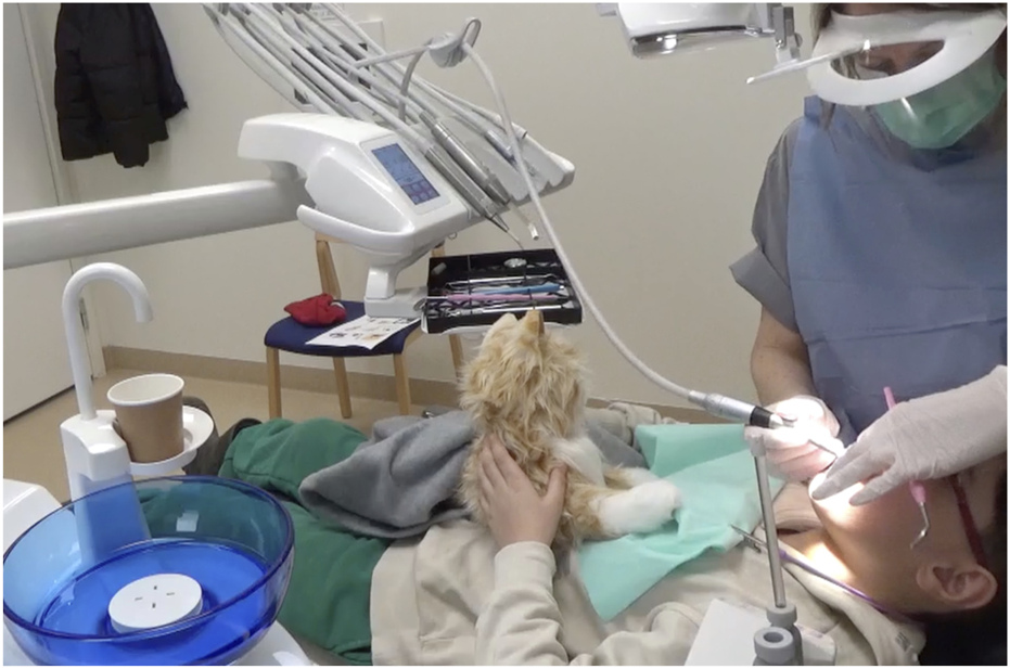Another patient who appears to benefit from the cat in terms of support for being in the dental situation is P5. P5 and P6 are twins and are facing similar difficulties; they are both undergoing EIBI, and they are both relatively new to the SDC unit (one previous visit to the dentist and 4–5 visits to the dental hygienist).