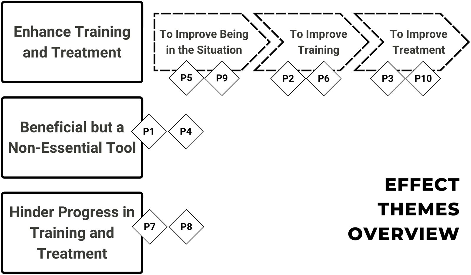 Overview of the effect themes enhance training and treatment, beneficial but a non-essential tool, and hinder progress in training and treatment with patients P1–P10.