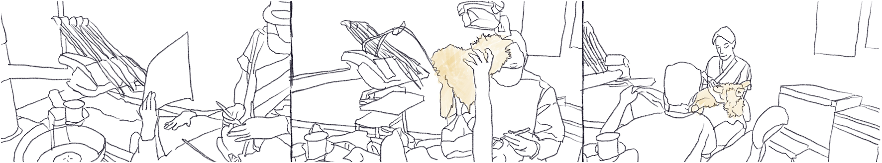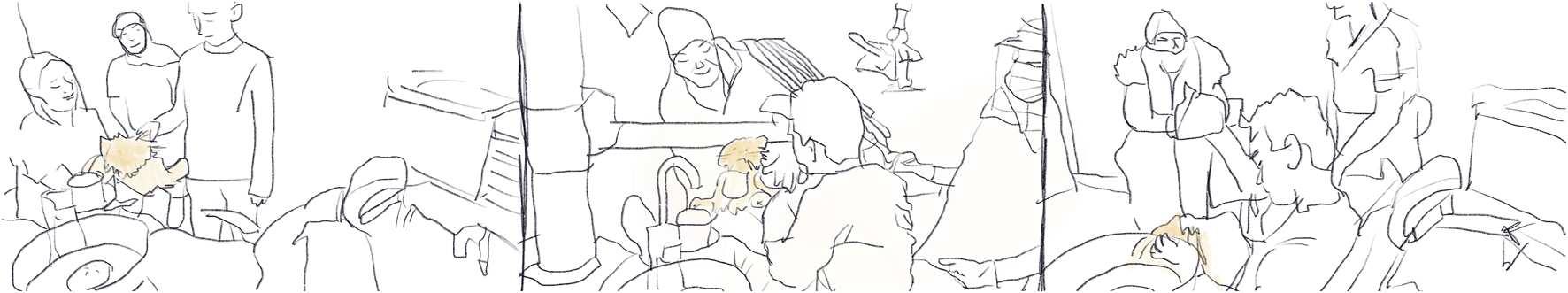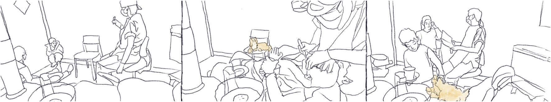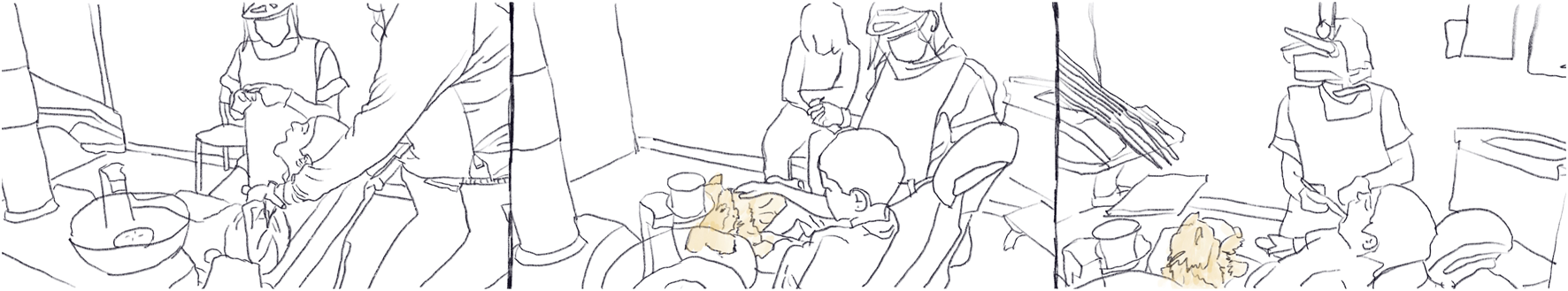 The focus for P6 (see Figure 6 for sketched frames) in the earlier sessions is on training to be in the room or situation at all, but toward the end of the year, progress was made to the point where the training for getting dental treatment could start. In the earlier sessions, the patient is explicitly and clearly unwilling to enter the room at all; at times, the guardian needs to carry the patient for him to enter. During the treatment, the patient needs to be held in place in the dental chair by the guardian. In the later sessions, the patient enters the room by himself and spontaneously sits for a short time in the dental chair. However, the guardian still has to sit in the chair with the patient while training for the dental care.