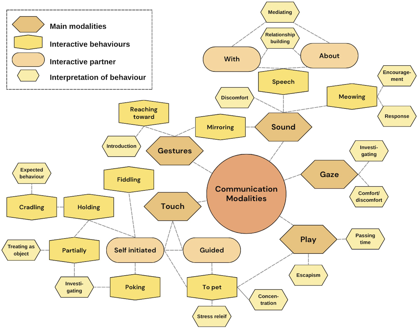 The reflexive TA process started when the first, third, and fourth authors held regular meetings during the year of data collection to discuss the participants’ progress and usage of the robot cat, reflecting on the video material that the first author viewed after each session and how the third author had experienced the sessions. The larger project (Thunberg et al., 20253) further involved interviews with guardians (conducted by the first author) that were also integrated into these reflections. During the guardian interviews, the first author asked specific questions related to what she had seen in the videos and encouraged them to reflect on that, integrating the guardians as experts on their children and as co-research workers. When the data collection was finalised, the first two authors watched the video material together while taking individual notes. Each participant, from the baseline video to the last visit with the robot cat, was watched consecutively to follow the process over the year. The authors reflected after each video, after each participant’s 4–6 videos (baseline included), and after certain sequences of importance. The results of the autism feelings chart were integrated into the video analysis, and the first author offered perspectives from the guardian interviews and from previous reflection meetings with the third and fourth authors. Even if this data collection is not specifically included nor reported on in this paper, the insights were unavoidable and strengthened the reflexive TA process to interpret the video data. After this process, the two authors coded their notes individually and reflected on these codes together, one participant at the time. As a next step, the authors combined the codes to themes in a visual code mapping session. A separate reflection on communication modalities and practice of how the robot cat was used by the participants, guardians, and the dental hygienist was conducted at the same session. The themes were then reflected upon together with the third and fourth authors to deepen the dental professional perspective on the HRI findings, especially through the third author’s own experience while collecting the data.