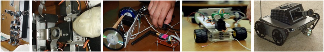 Undergraduate students from the systems, control, mechanical and geological engineering academic programs actively participated in the design and construction of several robotic prototypes, following a pre-stablished methodology. Notable advancements include a bipedal humanoid robot, including 23 direct current motors that facilitate sophisticated articulation. Similarly, a swagway was designed with bidirectional remote communication features and partially built from recycled materials. Notwithstanding its two-wheel configuration, the prototype exhibited exceptional stability during testing. A rover-type terrestrial vehicle was constructed, capable of wireless data transmission and reception, hence enhancing interaction possibilities in educational and experimental scenarios (see Figure 3).