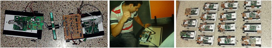 In our implementation with commercial components, each colony unit used Arduino-class microcontrollers (ATmega328P, 16 MHz, 2 KB SRAM), HC-SR04 ultrasonic distance sensors (range 2–400 cm; typical accuracy ± 3 mm) and/or Sharp GP2Y0A21YK0F infrared sensors (10–80 cm), with short-range communication inspired by educational swarm platforms (proximity IR, as in Kilobot and e-puck). Traction ran on 18,650 Li-ion cells (≈3.6–3.7 V; 3,200–3,400 mAh). In classroom tests, the typical runtime was on the order of 1 h (depending on charge and duty cycle) under a moderate duty cycle, consistent with comparable educational platforms (≥1.5 h in e-puck). Sensor calibration protocols, CPU load, and technical specifications used in the field are available in each component’s technical documentation and in specialized literature (Arduino, n.d.; HandsOnTec, 2017; Sharp Corporation, 2006; Rubenstein et al., 2012; GCtronic/EPFL, 2007; Jones et al., 2018).
