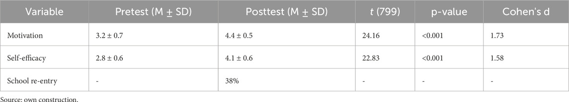 Data from 800 children and adolescents, chosen as a representative sample of the intervention population, were analyzed. Standardized instruments were utilized at two intervals (pretest and posttest), focusing on three dimensions: motivation for learning, self-efficacy in technology usage, and intention to re-enroll in educational institutions. The pre–post increases describe changes during the intervention period in the analyzed sample. In the absence of a comparison group, we do not interpret these results as conclusive evidence of causal effects; rather, we view them as consistent with an improvement temporally associated with the intervention (see Table 2).