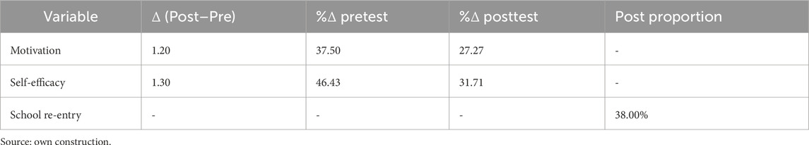 These results indicate positive and significant effects of the intervention, especially in terms of reactivating school interest in contexts of high exclusion.