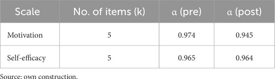 Expert review established content validity and guided item selection for rural contexts. The scales draw on previously validated instruments for academic motivation and digital self-efficacy (Pintrich et al., 1991; Compeau and Higgins, 1995). We assessed internal reliability using Cronbach’s alpha (Cronbach, 1951), which was estimated separately for the pretest and posttest. With the available data, motivation showed α = 0.974 (pre) and α = 0.945 (post); self-efficacy showed α = 0.965 (pre) and α = 0.964 (post).