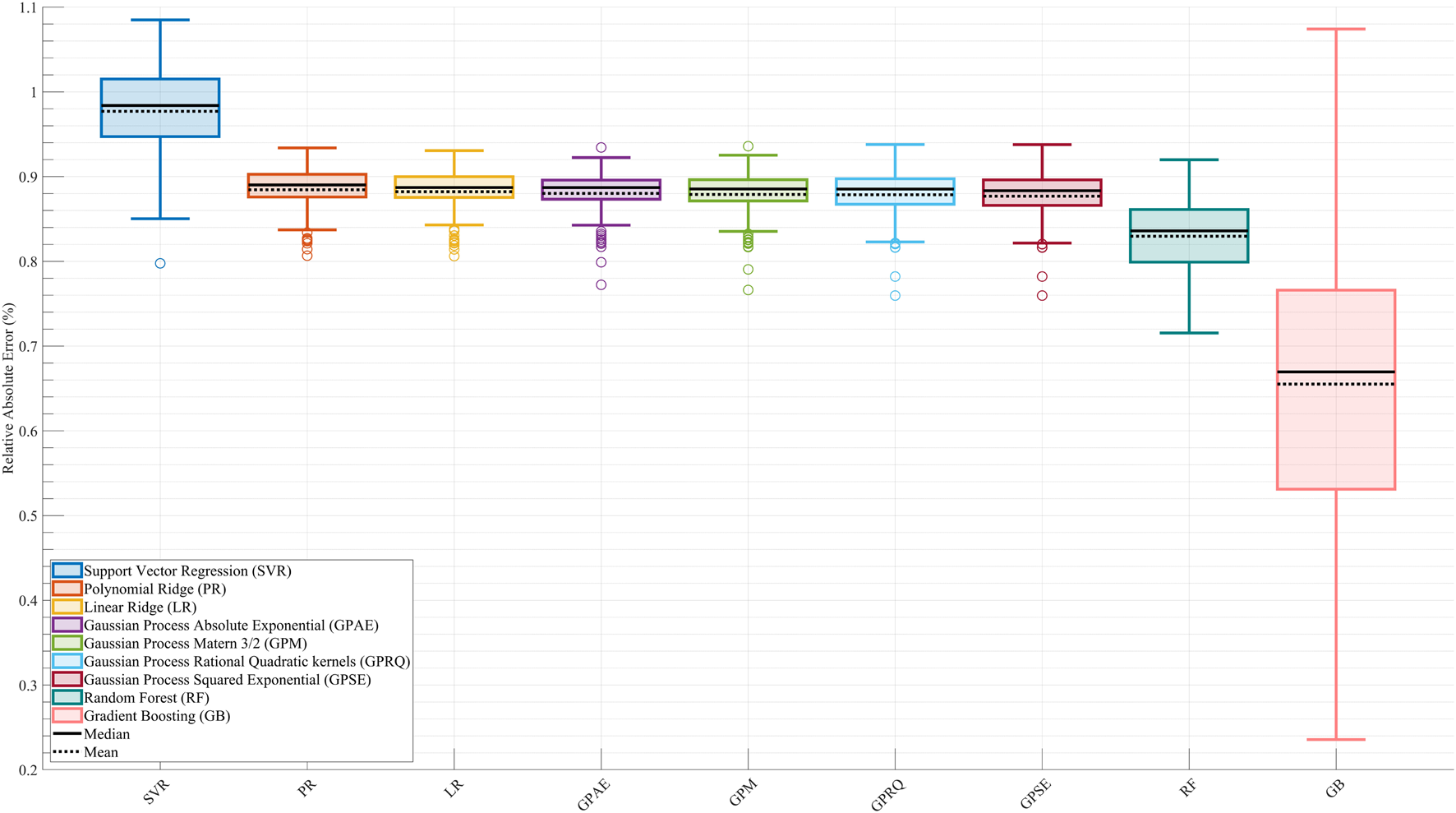 Figure 2. Comparison of surrogate model performance based on Relative Absolute Error Percentage (RAEP). Boxplots show RAEP distributions across all cross-validation splits for nine machine learning models: Linear Ridge (LR), Polynomial Ridge (PR), four Gaussian Process (GP) variants—Squared Exponential (GPSE), Matern 3/2 (GPM), Absolute Exponential (GPAE), and Rational Quadratic (GPRQ)—Support Vector Regression (SVR), Random Forest (RF), and Gradient Boosting (GB). GB achieved the lowest RAEP (0.66%) with greater variability, indicating high accuracy with some sensitivity to data distribution. SVR had the highest error (0.98%), while GP models and linear methods showed similar intermediate performance (0.88%). RF (0.83%) performed better than most but did not surpass GB. The solid black line in each boxplot represents the median RAEP value, and the dashed black line denotes the mean. While RAEP indicates that all models achieve relatively low average errors across cross-validation splits, this metric reflects generalizability on test sets and does not capture trial-specific deviations or nonlinear dynamics.