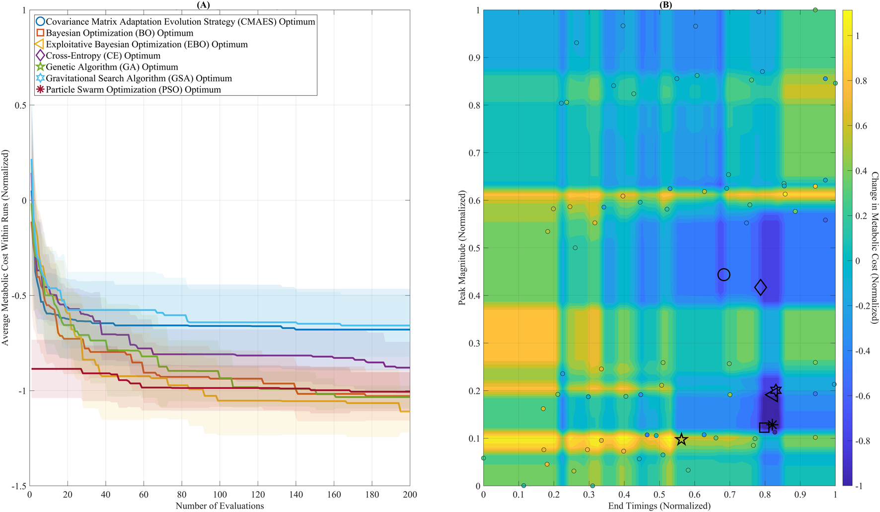 Figure 5. Optimization convergence and parameter landscape. (A) Convergence trajectories of seven global optimization algorithms over 200 evaluations, using the Gradient Boosting (GB) surrogate model. Algorithms include: Covariance Matrix Adaptation Evolution Strategy (CMAES), Bayesian Optimization (BO), Exploitative Bayesian Optimization (EBO), Cross-Entropy (CE), Genetic Algorithm (GA), Gravitational Search Algorithm (GSA), and Particle Swarm Optimization (PSO). BO, EBO, and PSO reached near-optimal solutions within the first 100 evaluations. GSA ultimately reached the lowest final cost but showed greater variability across iterations. (B) The GB-predicted metabolic cost surface is visualized as a filled contour plot across the assistance parameter space (Peak Magnitude and End Timing). Final optimal solutions from each algorithm are plotted, showing that most solutions converged within a low-cost region between Peak Magnitude 0.10–0.20 and End Timing 0.75–0.85.