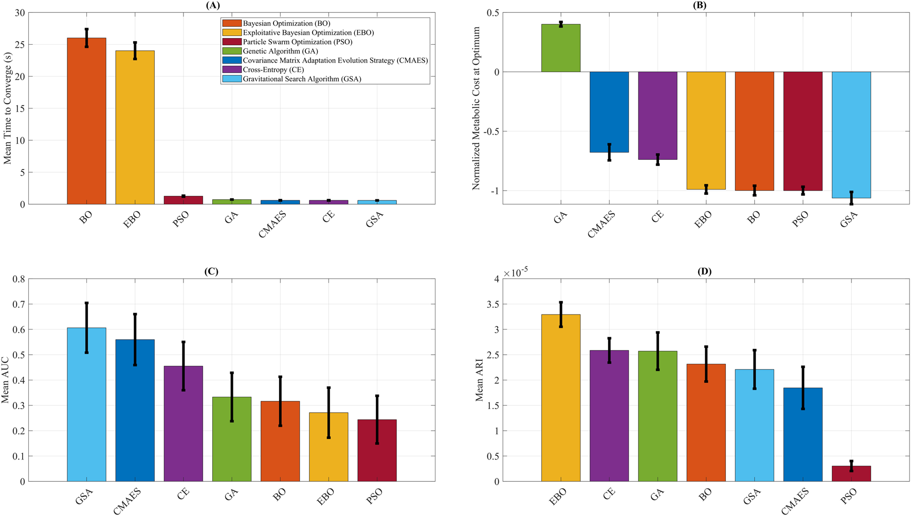 Figure 6. Optimization algorithm performance comparison. Summary of key performance metrics for Covariance Matrix Adaptation Evolution Strategy (CMAES), Bayesian Optimization (BO), Exploitative Bayesian Optimization (EBO), Cross-Entropy (CE), Genetic Algorithm (GA), Gravitational Search Algorithm (GSA), and Particle Swarm Optimization (PSO). (A) Mean time to convergence, highlighting the higher computational cost of BO and EBO relative to other methods. (B) Final normalized metabolic cost predicted by each algorithm, with GSA attaining the lowest value. (C) Mean area under the convergence curve (AUC), where lower values indicate higher optimization efficiency. (D) Average rate of improvement (ARI), representing the steepness of per-iteration cost reduction, with EBO yielding the highest ARI. The error bars reflect variability across repeated optimization runs, providing uncertainty quantification for convergence efficiency and predicted metabolic cost outcomes. To improve clarity for biomechanics-focused readers, we provide brief interpretations of the key metrics used in this study. The Relative Absolute Error Percentage (RAEP) quantifies how closely the surrogate model predicts metabolic cost relative to experimental ground truth, with lower RAEP reflecting greater predictive accuracy and alignment with physiological outcomes. The Area Under the Convergence Curve (AUC) measures the efficiency of an optimizer by integrating error reduction across iterations; a smaller AUC indicates faster and more reliable convergence toward an optimal assistance profile. The Adjusted Rank Index (ARI) evaluates the consistency and robustness of optimizer performance across repeated simulations, helping to identify stable strategies that are more likely to generalize in practice. The predicted metabolic cost provides surrogate-based estimates of energy expenditure under different assistance profiles, normalized to baseline walking, where lower values suggest potential reductions in user effort. Finally, optimization runtime represents computational latency in simulation rather than biological stabilization time, allowing algorithms to be compared on efficiency while acknowledging that human-in-the-loop experiments are dominated by physiological adaptation timescales.
