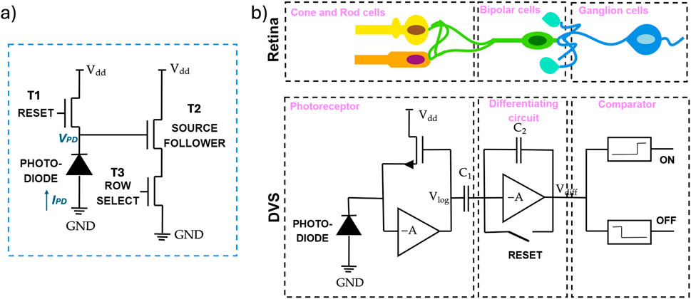 Traditional image- and video-acquiring technology primarily revolves around frame-based cameras capable of capturing a continuous stream of still pictures at a specific rate. Each still frame consists of a grid of 2D pixels with global synchronization, generated using sensor technologies like Charge-Coupled Devices (CCDs) or Complementary Metal Oxide-Semiconductor (CMOS) sensors. Due to their superior imaging quality, CCDs are favored in specialized fields such as astronomy (Polatoğlu and Özkesen, 2022), microscopy (Faruqi and Subramaniam, 2000), and others. These sensors feature arrays of photodiodes, capacitors, and charge readout circuits that convert incoming light into electrical signals. In contrast, CMOS sensors dominate consumer electronics due to their lower cost and sufficient image quality. CMOS sensors can be designed as either Active Pixel Sensors (APS) or, less commonly, Passive Pixel Sensors (PPS) (Udoy et al., 2024). A basic APS pixel sensor is comprised of a 3-transistor (3-T) cell, which includes a reset transistor
