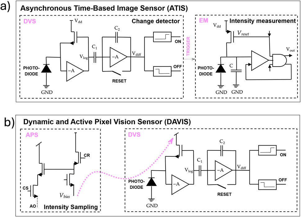 In addition, there are hybrid types of event-based sensors, which include Asynchronous Time Based Image Sensor (ATIS) and DAVIS, shown in Figures 2a,b, respectively. ATIS is a combination of DVS and Time to First Spike (TFS) technologies (Posch et al., 2010). Here, the DVS detects changes in the event stream, while Pulse Width Modulation (PWM) in the Exposure Measurement (EM) component enables the capture of absolute brightness levels. The second photodiode in the ATIS architecture allows it to measure both event intensity and temporal contrast. As a result, ATIS has a larger pixel area compared to DVS and produces enriched tripled data output. The output event of ATIS is