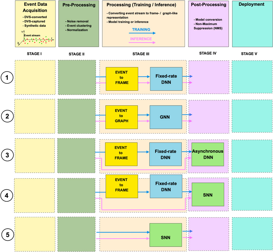Figure 3. Event-based object detection pipeline: event-data acquisition, pre-processing, processing, post-processing, and deployment. Five types of pipelines based on processing rate and backbone model architecture: fixed-rate dense, fixed-rate graph-based, asynchronous sense, asynchronous spike-based processing dense data, and asynchronous spike-based processing raw events.