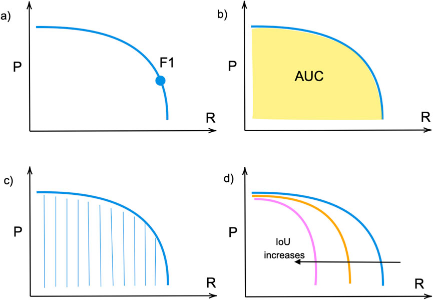 The precision-recall curve illustrates a trade-off at various confidence values. The model is considered good if the precision remains high as its recall increases (Padilla et al., 2020). The F1 score is the metric that shows the trade-off between precision P and recall R as illustrated in Figure 6a and can be found from Equation 3. It ranges between 0 and 1, where 1 shows the highest accuracy. Average Precision (AP) is identified individually for each class and represents the area under the curve (AUC) of the precision-recall corresponding to Figure 6b for that specific class as shown in Figure 6c. It measures how well the model balances precision (accuracy of positive predictions) and recall (coverage of actual positives) at different confidence thresholds. Eventually, mAP (Figure 6d) is the average of the Average Precision (AP) of each class.