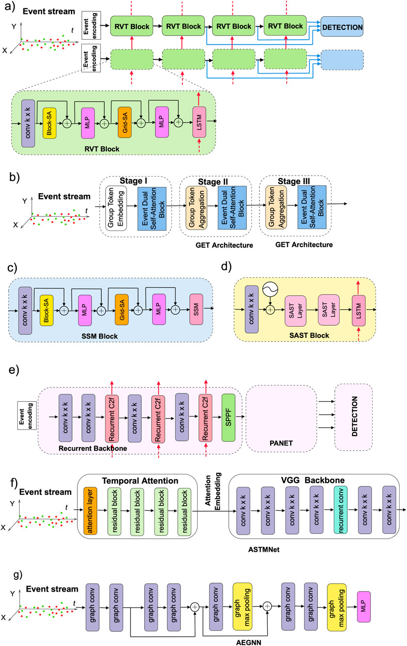 Figure 7. Schematic of fixed-rate (a) RVT and RVT Block; (b) GET architecture; (c) SSM Block; (d) SAST Block; (e) Recurrent YOLOv8; and asynchronous (f) ASTMNet; (g) AEGNN models.