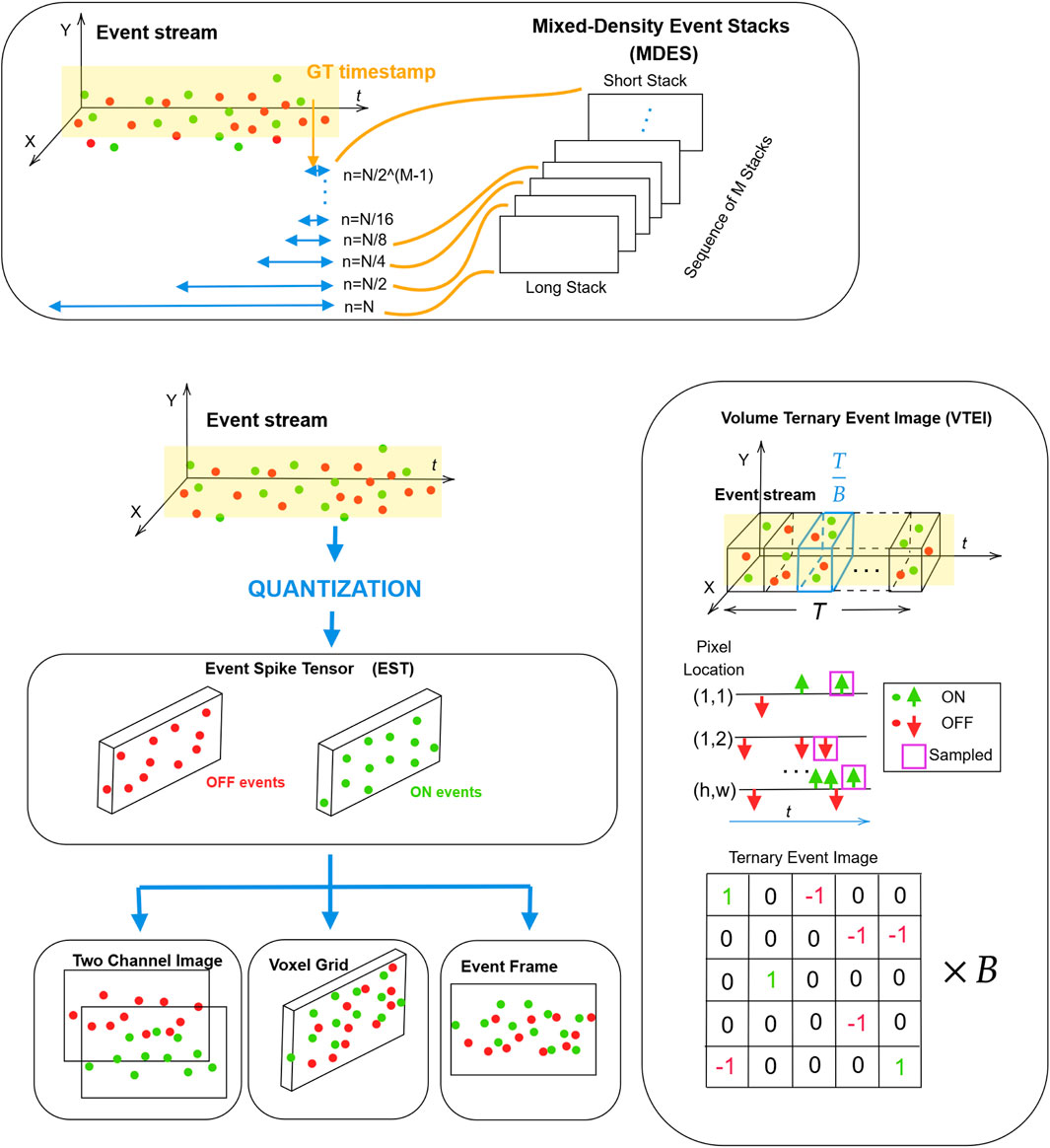 While effective algorithms and efficient hardware acceleration are crucial for processing event-based data, there are also techniques specifically aimed at enhancing the quality of the event data itself. These methods improve data representation and reduce noise to enhance performance (Shariff et al., 2024). A recent comprehensive survey on deep learning approaches for event-based vision and benchmarking provides a detailed taxonomy of the latest studies, including event quality enhancement and encoding techniques (Zheng et al., 2023). Another survey provides an overview of hardware and software acceleration strategies, with a focus on mobile sensing and a range of application domains (Wang H. et al., 2025). A recent work also surveyed algorithms, hardware, and applications in the event-based domain, highlighting the research gap (Cimarelli et al., 2025).